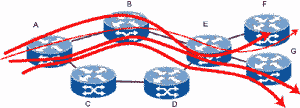 Еще один коренной недостаток традиционных методов маршрутизации трафика в сетях IP заключается в том, что пути выбираются без учета текущей загрузки ресурсов сети. Если кратчайший путь уже перегружен, то пакеты все равно будут посылаться по этому пути. Так, в сети, изображенной на Рисунке 1, верхний путь задействуется и в том случае, если его ресурсов постоянно не хватает для обслуживания трафика от А к E, а нижний простаивает, несмотря на то ресурсов маршрутизаторов B и C хватило бы для качественной передачи трафика. Налицо явная ущербность методов распределения ресурсов сети — одни из них работают с перегрузкой, а другие не используются вовсе. Никакие методы QoS данную проблему решить не могут — нужны качественно иные механизмы.