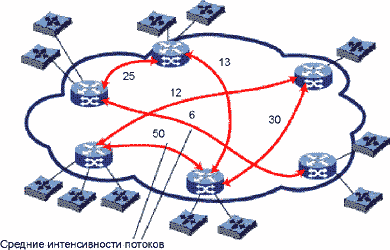 Исходными данными для выбора путей являются, во-первых, характеристики передающей сети — топология, а также производительность составляющих ее маршрутизаторов и каналов связи, а во-вторых, сведения о нагрузке сети, т. е. о потоках трафика, которые она должна передать между своими пограничными маршрутизаторами (см. Рисунки 2а и б). Каждый поток характеризуется точкой входа в сеть, точкой выхода из нее и некоторыми параметрами трафика. Так как при выборе путей мы стремимся обеспечить равномерную загрузку маршрутизаторов и каналов связи, то для каждого потока, как минимум, нужно учитывать его среднюю интенсивность (что и показано на Рисунке 2а). Для более тонкой оптимизации трафика в сети можно привлекать и более детальное описание каждого потока: например, величину возможной пульсации трафика или требования к качеству обслуживания — чувствительность к задержкам, вариации задержек и допустимый процент потерь пакетов. Однако, поскольку оценить такого рода параметры трафика более сложно, чем среднюю интенсивность, а их влияние на функционирование сети менее значительно, чтобы найти оптимальное распределение путей прохождения потоков через сеть, учитываются только параметры их средней интенсивности.