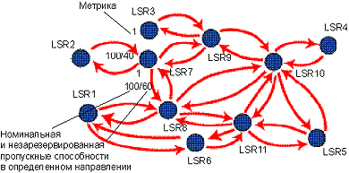 Для решения задачи TE в протоколы OSPF и IS-IS включены новые типы объявлений для распространения по сети информации о номинальной и незарезервированной (доступной для потоков TE) пропускной способности каждой связи. Таким образом, ребра результирующего графа сети, создаваемого в топологической базе каждого маршрутизатора, будут маркированы этими двумя дополнительными параметрами (см. Рисунок 5).
