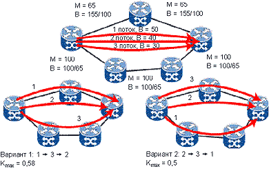 Однако существует лучший способ, представленный в варианте 2. Здесь по верхнему пути A-B-C были направлены потоки 2 и 3, а поток 1 — по нижнему пути A-D-E-C. Ресурсы верхнего пути оказываются загружены на 0,45, а нижнего — на 0,5, т. е. налицо более равномерная загрузка ресурсов, а максимальный коэффициент использования по всем ресурсам сети не превышает 0,5. Этот вариант может быть получен при одновременном рассмотрении всех трех потоков с учетом ограничения min (max Ki) или же при рассмотрении потоков по очереди в последовательности 2 -> 3 -> 1.