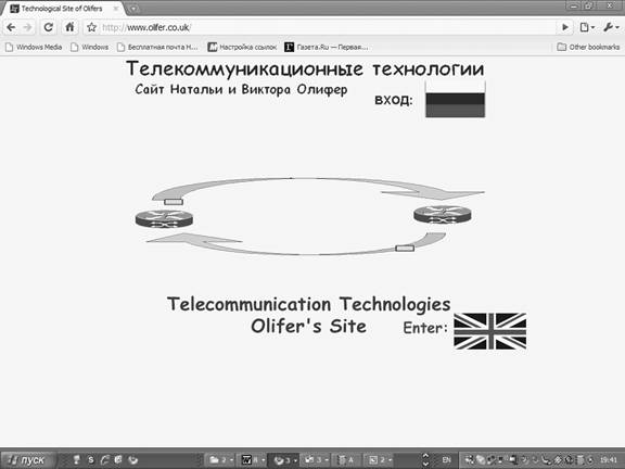 После того как вы набрали имя и нажали клавишу Enter, ваш компьютер отправляет в сеть запрос к указанному вами источнику информации. Запрос путешествует по Сети, пока не достигнет компьютера, на котором расположен веб-сайт www.olifer.co.uk. Этот запрос, как и все остальные запросы, поступающие на данный веб-сайт, принимается и обслуживается специальной программой, называемой веб-сервером (web server) По отношению к веб-серверу браузеры выступают клиентами. В ответ на поступивший запрос веб-сервер сайта www.olifer.co.uk передает информацию, размещенную на его главной странице, вашему браузеру, который и выводит ее на экран вашего компьютера в том виде, как показано на рисунке..