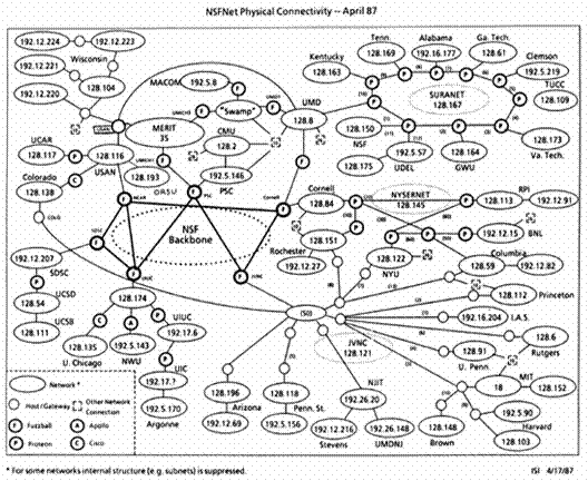 Из рисунка хорошо видно, что в 1987 Интернет не имел какой-либо регулярной структуры, сети были связаны между собой достаточно хаотичным образом и между многими из них существовало несколько возможных маршрутов обмена данными. Такая децентрализованная структура Интернета была выбрана не случайно, это был один из архитектурных принципов его построения, и этот принцип хорошо зарекомендовал себя в процессе бурного роста Интернета, поэтому и сегодня структура Интернета остается такой же хаотичной, какой была на заре его развития.