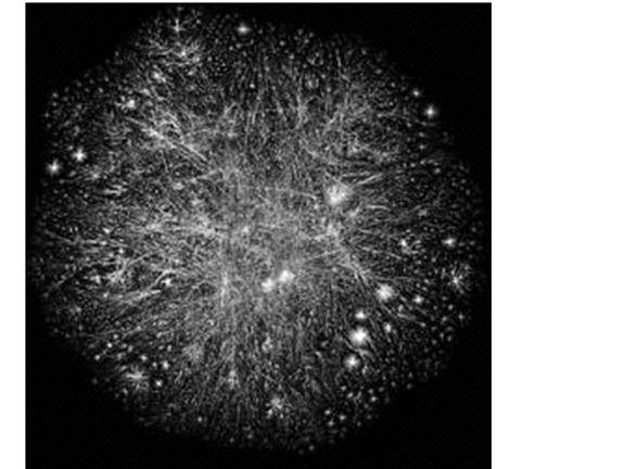 Однако сейчас визуально представить Интернет стало нетривиальной задачей, потому что Интернет превратился во Всемирную паутину, связывающую миллионы сетей. Над визуализацией Интернета работают ученые и энтузиасты, и один из вариантов такого представления, полученый в результате анализа компьютерной программой трафика между узлами сети, показан на рис. 1.3.