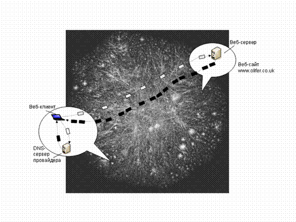 Однако что же все-таки происходило в первые мгновения после нажатия клавиши Enter? Может быть, сеть дала сбой, и первый пакет просто заблудился? Или же это нормальная ситуация? Отгадка кроется в тех белых пакетах, которые потом пошли к нужному серверу. Если мы посмотрим на них внимательнее, то заметим, что заголовки всех этих пакетов содержат один и тот же адрес назначения — 69.73.175.185. Адреса такого вида называются IP-адресами. Именно IP-адрес 69.73.175.185, а не имя www.olifer.co.uk использовали маршрутизаторы Интернета, чтобы направить белые пакеты в правильном направлении. Прежде, чем отправить пакеты в Сеть, браузер должен был получить ответ на вопрос «Какой IP-адрес соответствует имени www.olifer.co.uk?» Как раз этот вопрос и содержался в самом первом белом пакете, отправленном браузером по заранее известному ему адресу сервера провайдера, который хранит таблицу соответствия имен и IP-адресов (так называемый DNS-сервер). А первый черный пакет доставил браузеру ответ DNS-сервера в форме «Это адрес 69.73.175.185».