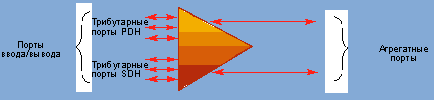Oсновным элементом сети SDH является мультиплексор (см. Рисунок 1). Обычно он оснащен некоторым количеством портов PDH и SDH: например, портами PDH на 2 и 34/45 Мбит/с и портами SDH STM-1 на 155 Мбит/c и STM-4 на 622 Мбит/c. Порты мультиплексора SDH делятся на агрегатные и трибутарные. Трибутарные порты часто называют также портами ввода/вывода, а агрегатные — линейными. Эта терминология отражает типовые топологии сетей SDH, где имеется ярко выраженная магистраль в виде цепи или кольца, по которой передаются потоки данных, поступающие от пользователей сети через порты ввода/вывода (т. е. втекающие в агрегированный поток: tributary дословно означает «приток»).