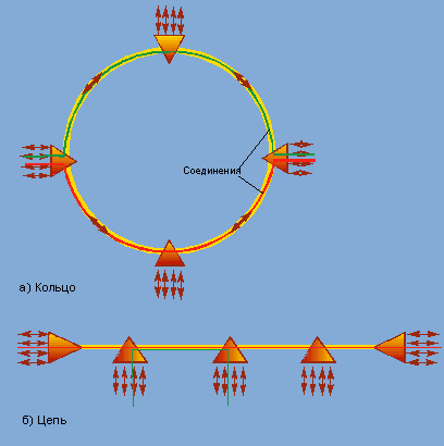 Цепь (см.Рисунок 4б) — линейная последовательность мультиплексоров, из которых два оконечных играют роль терминальных, а остальные — мультиплексоров ввода/вывода. Обычно сеть с шинной топологией применяется в тех случаях, когда узлы имеют соответствующее географическое расположение, например вдоль магистрали железной дороги или трубопровода.