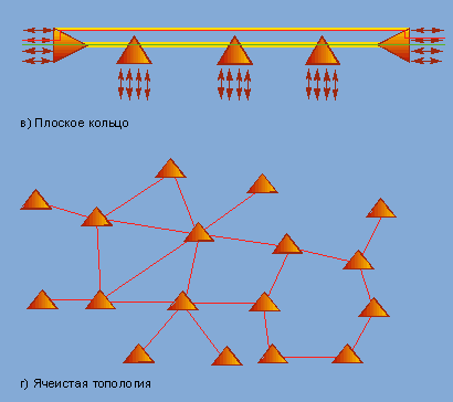 Эти базовые топологии могут комбинироваться при построении сложной и разветвленной сети SDH, образуя участки с радиально-кольцевой топологией, соединениями «кольцо-кольцо» и т. п. Наиболее общим случаем является ячеистая топология сети (см. Рисунок 4г), при которой мультиплексоры имеют большое количество взаимных связей, а сеть может достичь очень высокой производительности и надежности.