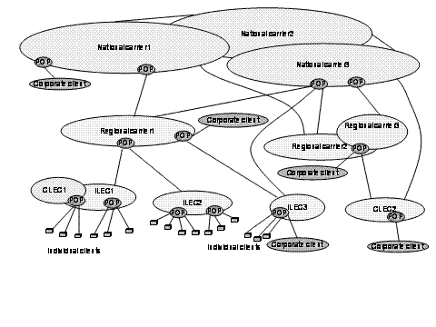 Как видно из рисунка, в современном конкурентном телекоммуникационном мире нет строгой иерархии операторов, взаимосвязи между ними и их сетями могут быть достаточно сложными и запутанными. Например, сеть CLEC2 имеет непосредственную связь не только с сетью регионального оператора 3, как того требует иерархия, но и непосредственную связь с национальным оператором 3 (возможно, этот оператор предлагает более дешевые услуги по передаче международного трафика, чем это делает региональный оператор 3). Не все операторы на рисунке имеют собственную транспортную инфраструктуру (например, CLEC1). Как это часто бывает в таких случаях, оператор CLEC1 предоставляет только дополнительные информационные услуги, например, предлагает клиентам оператора ILEC1 видео по требованию или разработку и поддержание их домашних страниц в Интернете. Свое оборудование (например, видео-сервер) такой оператор часто размещает в POP другого оператора, как это и показано в данном случае.