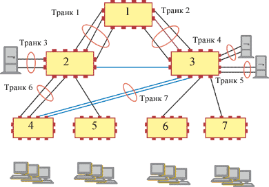 Затем коммутатор повторяет процедуру изучения данных адресов, дожидаясь, когда один из них придет на какой-либо порт транка, после чего они снова становятся изученными. Далее процедура назначения сеансов портам выполняется заново, естественно с учетом только работающих портов. Так как тайм-ауты в сеансах протоколов локальных сетей обычно небольшие, то время восстановления соединения оказывается коротким.