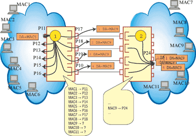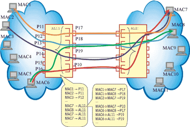 В примере, изображенном на Рисунке 3, в таблице продвижения вместо портов P17, P18, P19 и P10 фигурирует логический порт AL11. С ним связаны адреса всех узлов, путь к которым лежит через коммутатор 2. Выявление неизвестного адреса на любом из физических портов, входящих в транк, приводит к появлению в таблице продвижения коммутатора новой записи с идентификатором логического порта. Поступающий в коммутатор кадр, адрес назначения которого изучен и связан с идентификатором логического порта, передается на один (и только один!) выходной физический порт, входящий в состав транка. Точно так же коммутатор поступает с неизученными, широковещательными и групповыми адресами — для передачи кадра используется только одна из связей. На порты коммутатора, не входящие в транк, это изменение в логике обработки кадров не распространяется: так, коммутатор 1 всегда передает кадр с неизученным или широковещательным адресом на порты P11–P16.